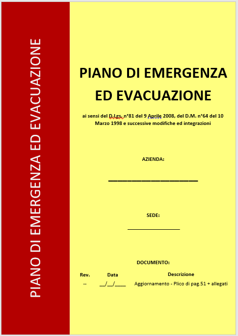 Il piano di emergenza ed evacuazione è il principale strumento con la quale vengono predisposte le azioni da mettere in atto al verificarsi di un evento emergenziale, quali incendi e terremoti, che potrebbero mettere a repentaglio l’incolumità dei lavoratori e delle altre persone presenti sul luogo di lavoro. Non si tratta di un documento di valutazione ma uno strumento di gestione del rischio.